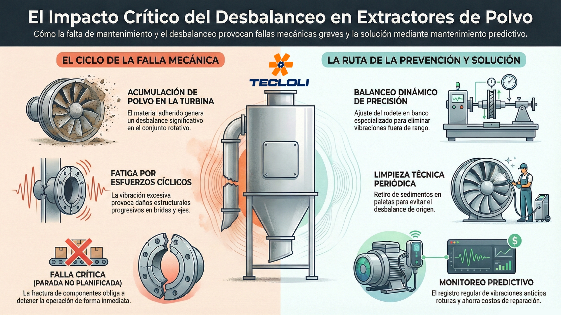 Cuando un extractor de polvo industrial presenta vibraciones altas, ruido anormal o fracturas en bridas, no se trata solo de “cambiar piezas y seguir”. Es una señal clara de que el sistema necesita balanceo y mantenimiento predictivo.