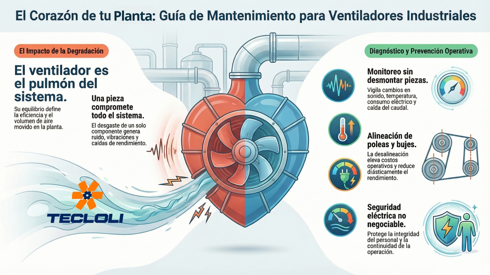 Pequeños detalles pueden causar grandes paradas: limpieza de aspas, inspección de bujes y poleas, y control eléctrico son esenciales. En Tecloli, acompañamos a la industria peruana ofreciendo soluciones de ventilación industrial confiables y asesoría técnica para maximizar el rendimiento y prolongar la vida útil de tus equipos. Recuerda: detectar fallas a tiempo es ahorrar energía, proteger tu inversión y garantizar seguridad en planta.
