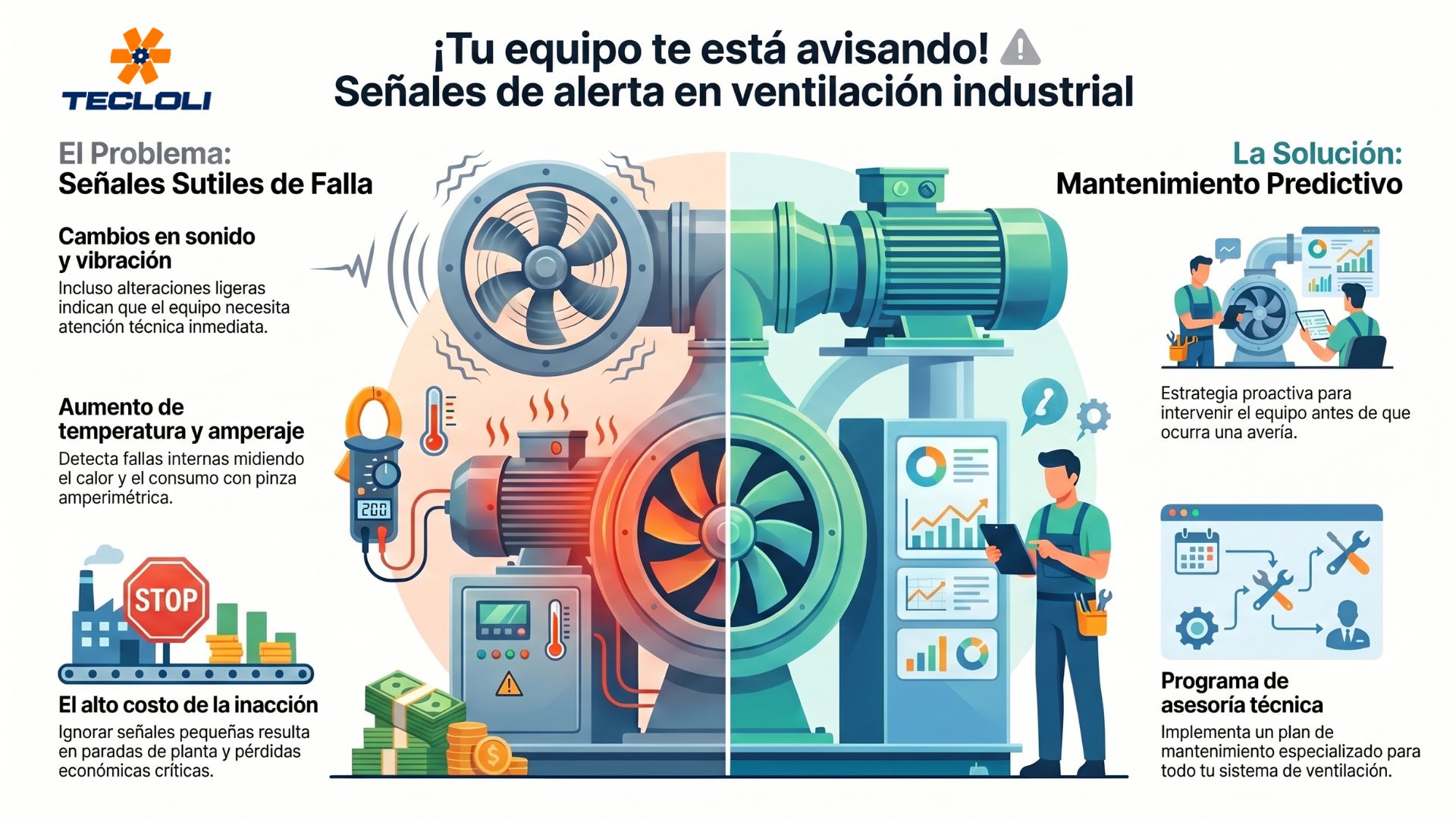 Los sistemas de ventilación industrial ofrecen pistas tempranas de problemas que, si se ignoran, pueden derivar en fallas graves y costosas. Implementar un mantenimiento predictivo profesional, con monitoreo de ruidos, vibraciones y consumo eléctrico, asegura la productividad, seguridad y vida útil de tus equipos. Para lograrlo, contar con asesoría especializada es clave: Tecloli brinda soporte integral en ventilación industrial para mantener tu planta siempre operativa y eficiente.