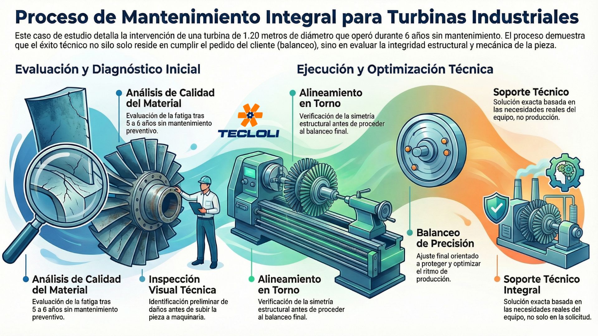 El enfoque de Tecloli no busca solo restaurar la turbina superficialmente, sino ofrecer soporte integral que maximice la productividad y prolongue la vida útil del equipo: